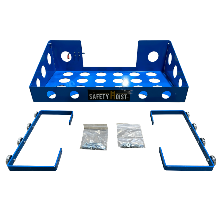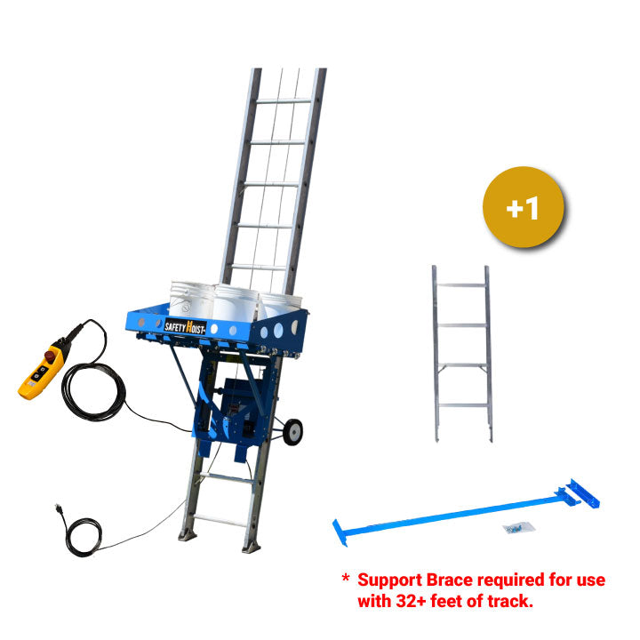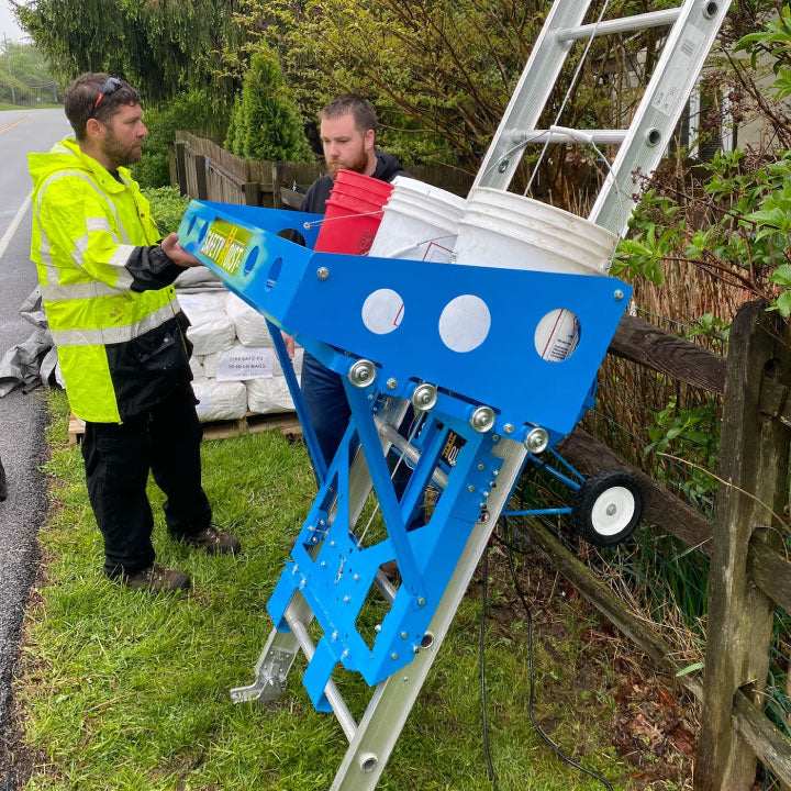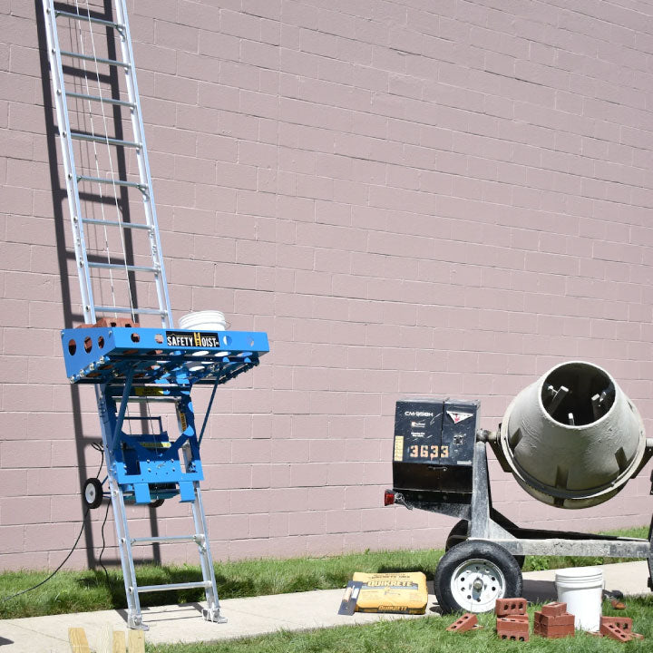 The patented EH-500UT ladder hoist is designed and manufactured to allow the operator to stand up to 16 feet away from the overhead load while having full operational capabilities right at your fingertips. The EH-500UT can safely lift up to 500 lbs or buckets, bricks, tiles, mortar, and so much more.
