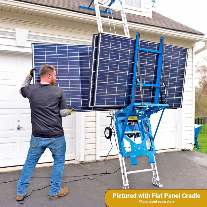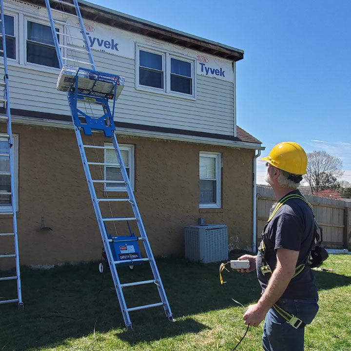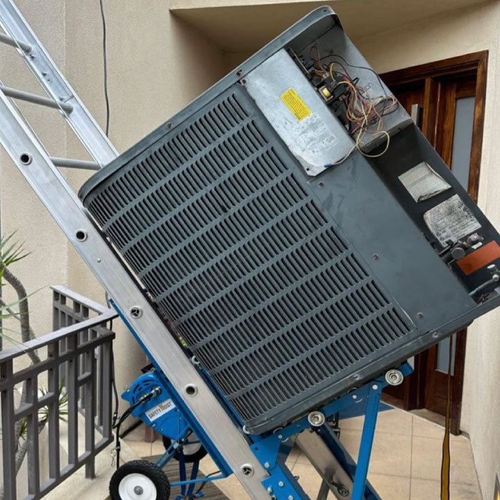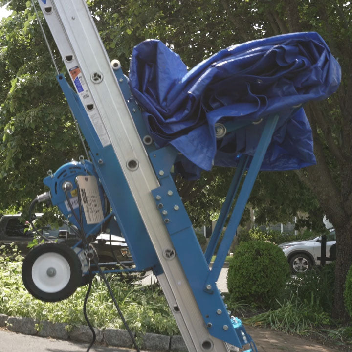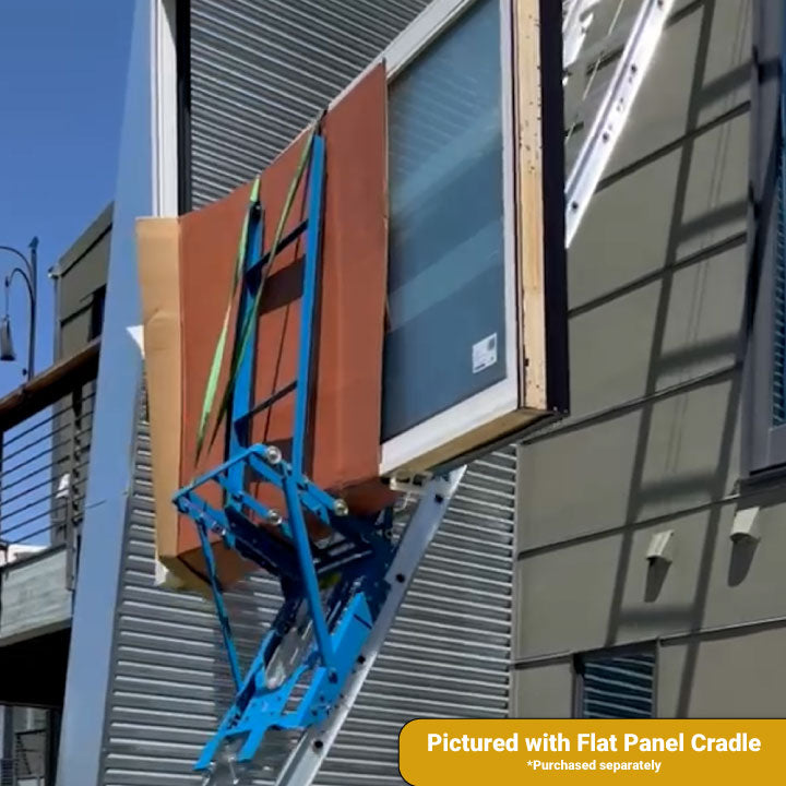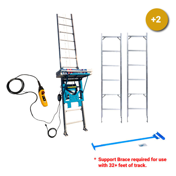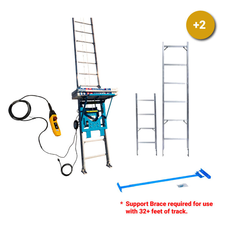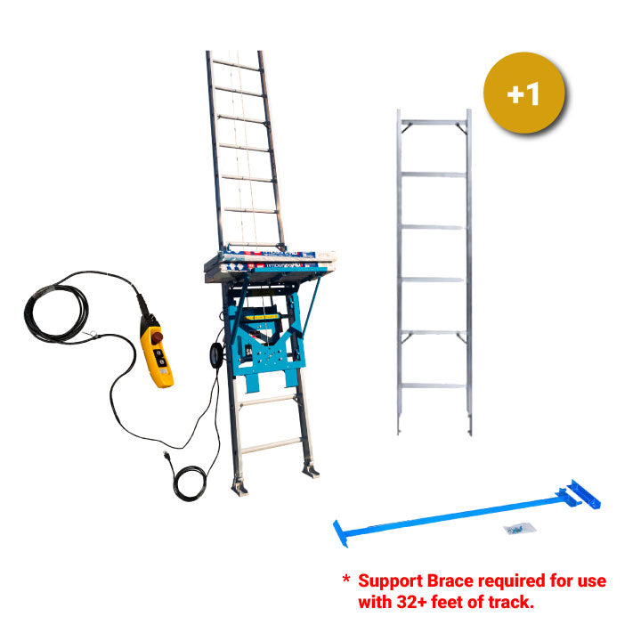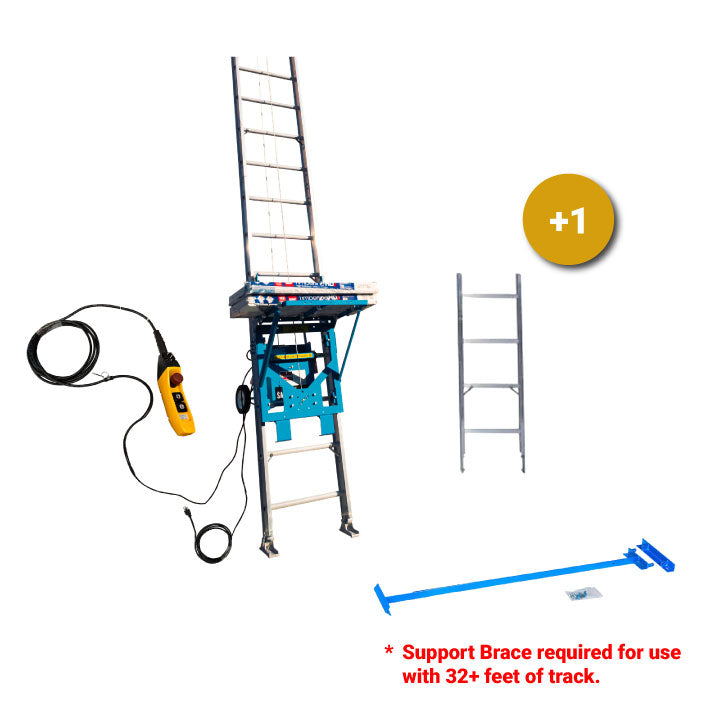 The patented EH-500 ladder hoist is designed and manufactured to allow the operator to stand up to 16 feet away from the hoist while having full operational capabilities right at your fingertips. The EH-500 can safely lift up to 500 lbs and comes standard with 28 feet of track -- with a max height of 44 feet.